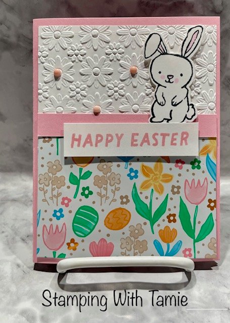 Pretty In Pink Cardstock #163793 $14.00 5-1/2″ x 8-1/2″ score @ 4-1/4″ and 1 pc 1/2″ x 4″, Basic White Cardstock #166780 $14.00 4″ x 5-1/4″ embossed with Lazy Day embossing folder coming in March #167196$11.00, Easter Joy Specialty Designer series paper #166939 $16.50 3″ x 4″, Easter basket bundle #166947 $49.50, Muted Palette Dots #165155 $8.00. Pretty in Pink Ink #163807 $9.00, Light Bubble Bath Blender #161675 $11.00.