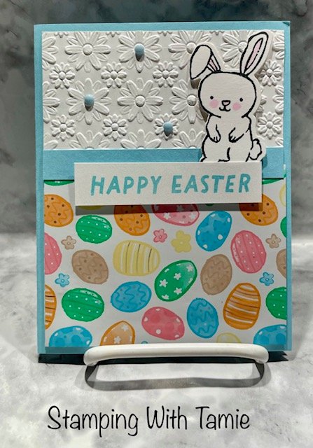 Balmy Blue Cardstock #146982 $14.00 5-1/2 x 8-1/2″ score @ 4-1/4″ and 1 pc 1/2″ x 4″ Basic White Cardstock #166780 $14.00 4″ x 5-1/4″ embossed with Lazy Day embossing folder coming in March #167196$11.00, Easter Joy Specialty Designer series paper #166939 $16.50 3″ x 4″, Easter basket bundle #166947 $49.50, Muted Palette Dots #165155 $8.00. Balmy Blue Ink #147105 $9.00, Light Bubble Bath Blender #161675 $11.00.