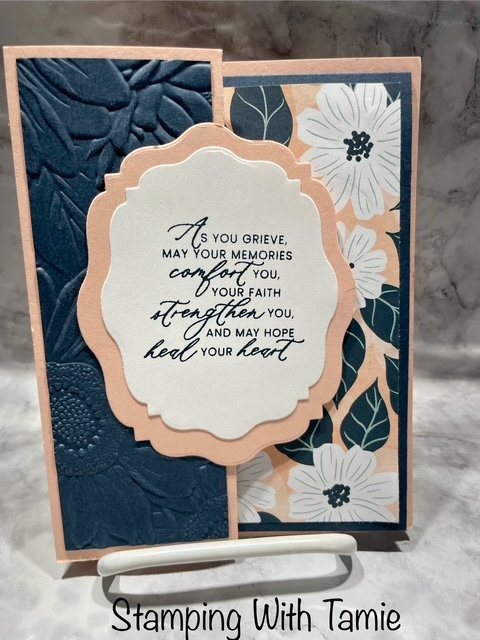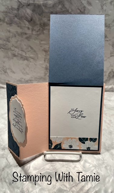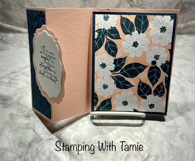 Materials I used: Petal Pink Cardstock #146985 $14.00 5-1/2″ x 8-1/2″ score @ 2-1/8″ and 4-1/4″, Secret Sea Cardstock #1656254 $14.00 4″ x 5-1/4″ score @ 5-1/4″ and 1-7/8″ x 5-1/4″, Lovely Blossoms DSP #167168 $12.50 3-3/4″ x 5″ and 1″ x 3-3/4″, Basic White Cardstock #166780 $14.00 3-3/4″ x 5″, Sunflower Embossing Folder 166145 $12.00, Beautiful Celebrated Dies #166974 $35.00, Prayers & Promises Stamp Set #167014 $20.00, Secret Sea Ink #165285$ 9.00.
