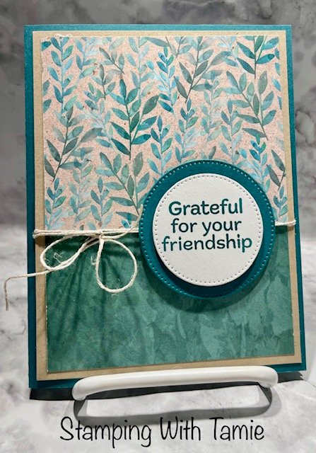 My card tonight is using the Perennial Lavender 12 x 12 Designer Series Paper #162593 $12.50 3-3/4″ x 3″ (2) pcs. Pretty Peacock cardstock #150880 $14.00 4-1/4″ x 11″ score at 5-1/2″, Crumb Cake Cardstock #120953 $14.00, Stylish Shape Dies #159183 $30.00, Linen Thread #104199 $5.00, Pop Up Petals Stamp Set #167041 $24.00, Pretty Peacock Ink #150083 $9.00.