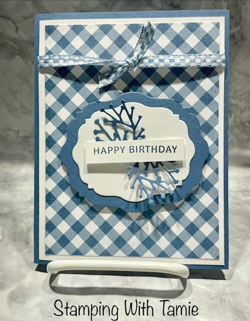 Misty Moonlight Cardstock #153081 $14.00 5-1/2″ x 8-1/2″ score @ 4-1/4″, Basic White Cardstock #166780 $14.00, 4″ x 5-1/4″, Homemade Sweetness DSP #167467 $12.50 3-3/4″ x 5″, Beautifully Celebrated Dies #166974 $35.00, Lovely Arrangement Stamp Set #167169 $20.00, Misty Moonlight Ribbon #167480 $8.00, Misty Moonlight ink #153118 $9.00.