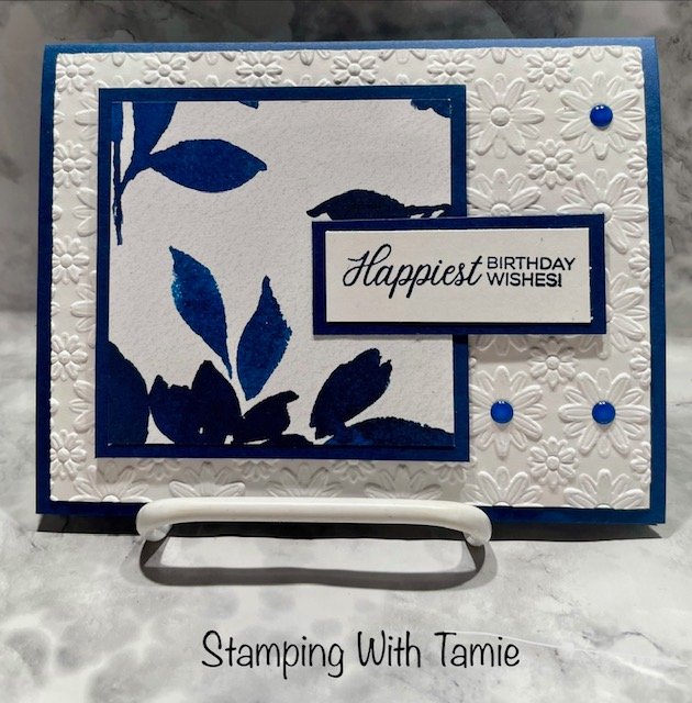 Night of Navy Cardstock #100867 $14.00 5-1/2″ x 8-1/2″ score @ 4-1/4″ and 3-1/4″ x 3-1/4″, Basic White cardstock #166780 $14.00 4″ x 5-1/4″ for outside and inside. Lazy Daisy 3D Embossing Folder #167196 $11.00 (currently unavailable, due back in stock April 27th) Garden Poetry designer series paper #167113 $12.50 3″ x 3″, Phrases & Frames Stamp Set #167581 (Coming in May in new catalog) Garden Epoxy Dots #167124 $8.00 (currently on back order, due back in stock April 27th. I didn’t realize just about everything on this card is not available, sorry about that.